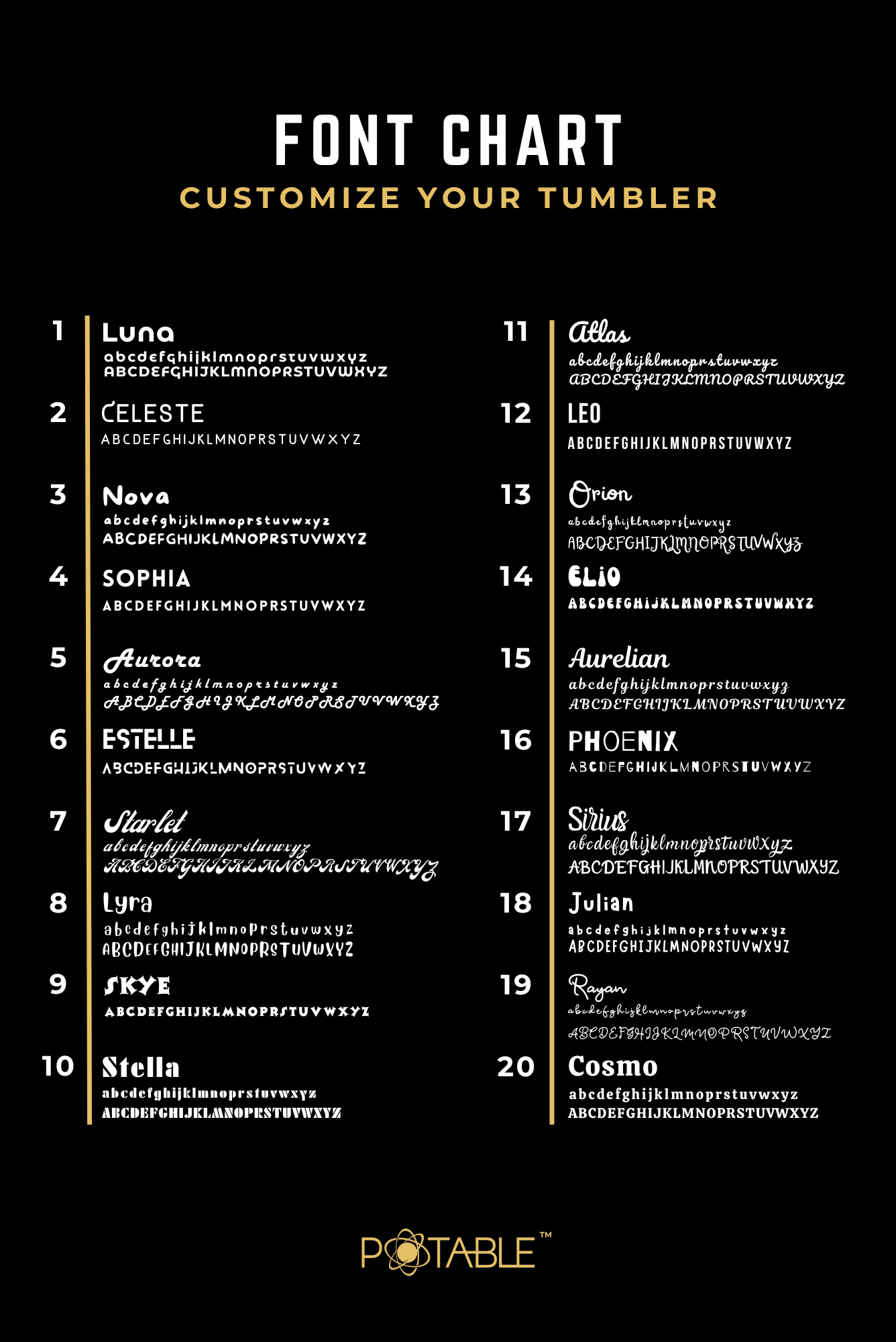 Choose your font. Define your layout. Potable™ will do the rest with the same quality that makes Potable™ a standard for high-end luxury drinkware. Whether you're ordering one or one hundred, each piece is crafted and shipped with care, consistency, and an unmatched finish.